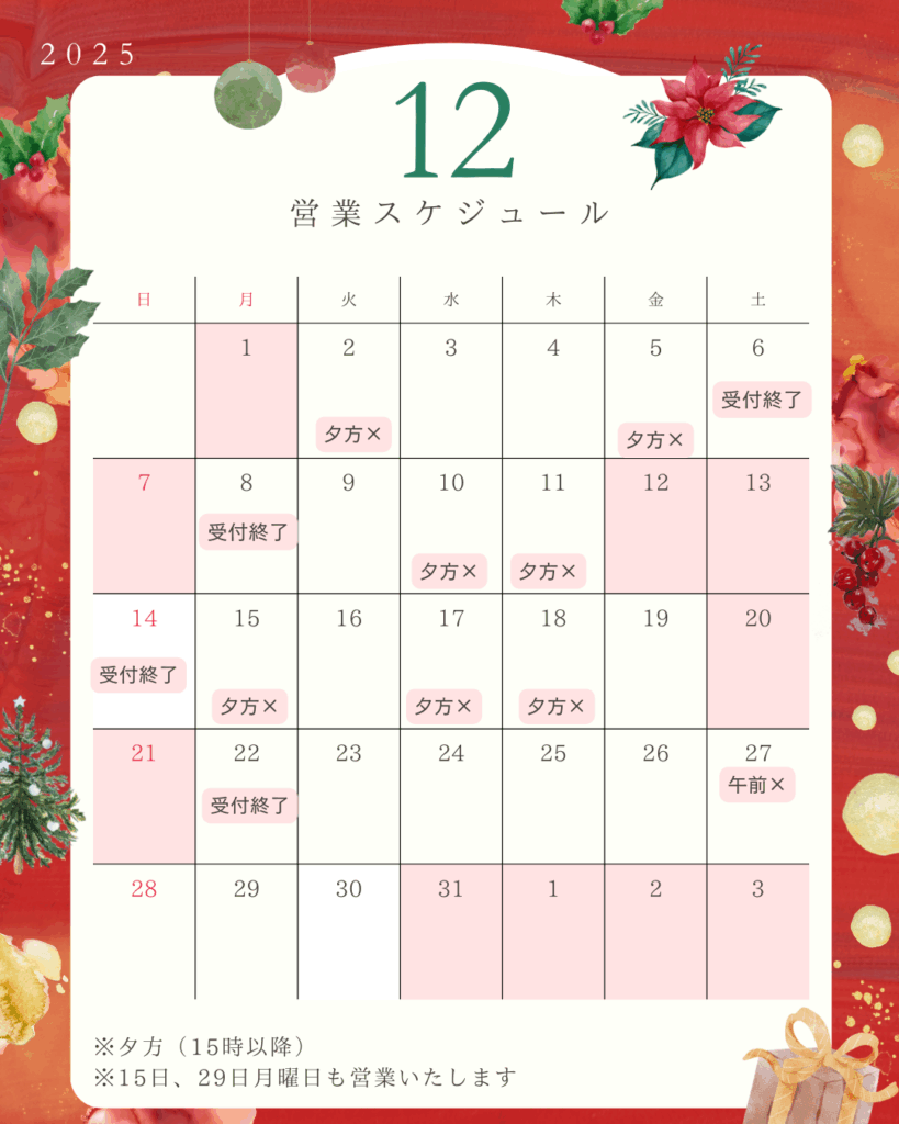 12月の営業スケジュールはカレンダーに掲載しておりますので、そちらをご確認ください。