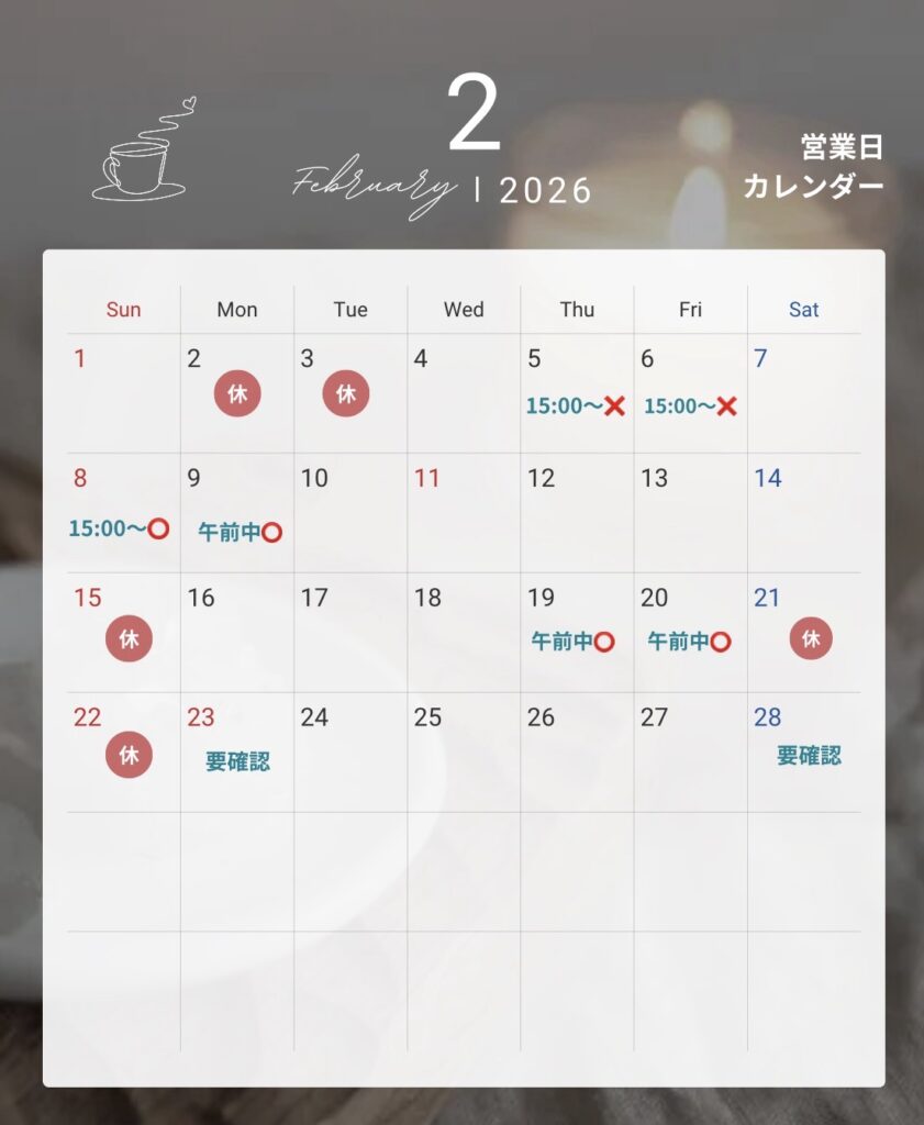 NEWS 2026年2月お知らせ📢 2026年2月1日 by mayu いつもコクーンに足を運んでいただき、ありがとうございます。 不定休や営業時間変更などのため、ご来店の際にご 不便をおかけしておりますが、いつもご理解いただ き、ありがとうございます。 2026年2月の定休日は下記の通りです。 ・2日(月) ・3日(火) ・15日(日) ・21日(土) ・22日(日) ※ 23日(月・祝)、28日(土)の営業につきまして は決まり次第、お知らせいたします。 ご来店の際は、事前にご確認いただけますと幸いです。 2月も、皆さまにお会いできるのを楽しみにしております。